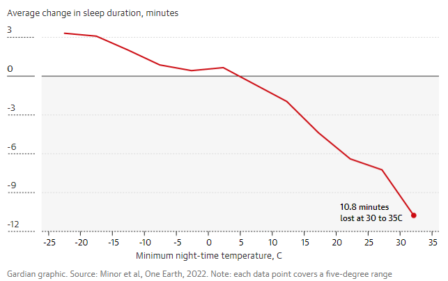 Dobar san je ključan za zdravlje i dobrobit čovjeka. Ali globalno zagrijavanje povećava noćne temperature, čak i brže nego danju, što veoma otežava spavanje. Analiza je otkrila da prosječni građanin već gubi 44 sata sna godišnje, što dovodi do 11 noći s manje od sedam sati sna, a što je standardno mjerilo za dovoljno sna.