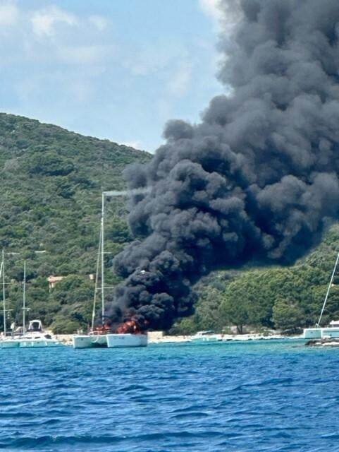 Gusti crni dim nadvio se nad otok Drvenik Veli, a u plamenu je brod kod plaže Krknjaši, poznatije kao "Plava laguna.