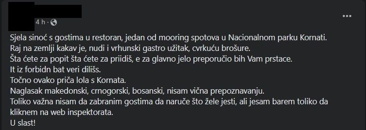 - Sjela sinoć s gostima u restoran, jedan od mooring spotova u Nacionalnom parku Kornati. Raj na zemlji kakav je, nudi i vrhunski gastro užitak, cvrkuću brošure. Šta ćete za popit šta ćete za priidiš, e za glavno jelo preporučio bih Vam prstace. It iz forbidn bat veri dilišs. Točno ovako priča lola s Kornata. Naglasak makedonski, crnogorski, bosanski, nisam vična prepoznavanju. Toliko važna nisam da zabranim gostima da naruče što žele jesti, ali jesam barem toliko da kliknem na web inspektorata. U slast! - kaže gošća, koja je inače po struci novinar i jako dobro zna što je zabranjeno, a što ne.