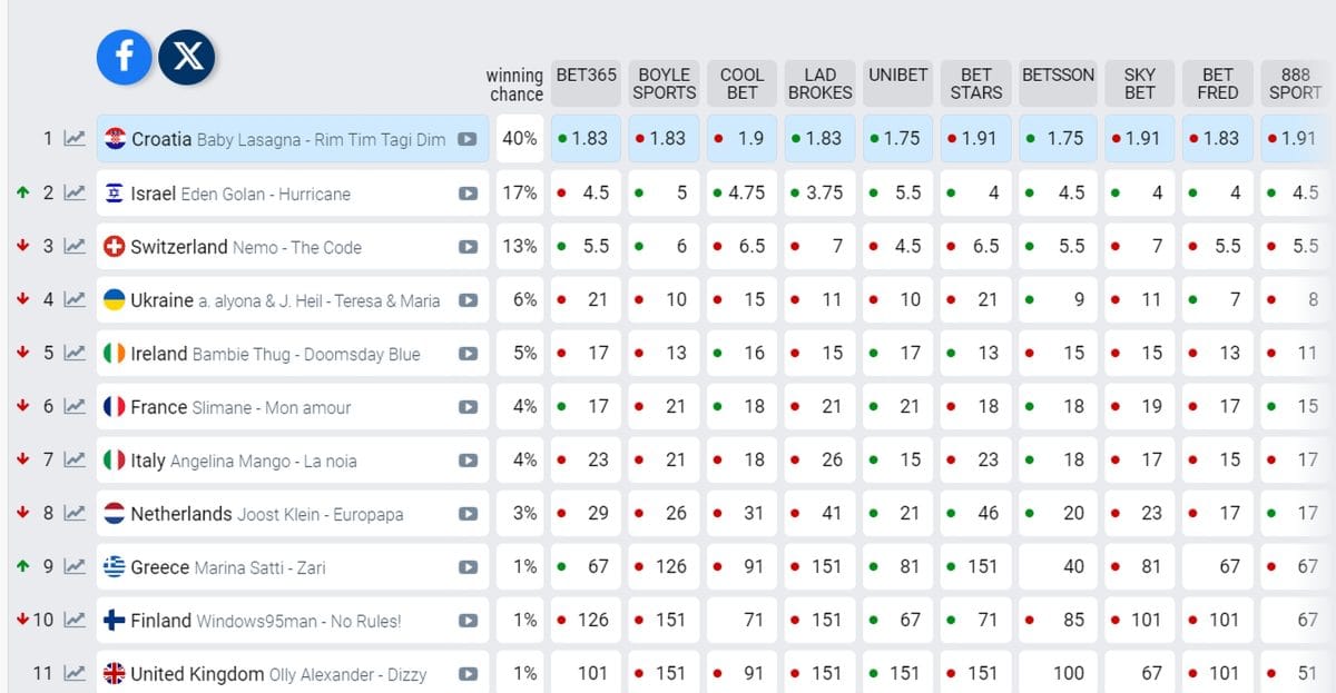 Ipak, na kladionicama Marko je neumoljivo, i dalje prvi, s 40 posto šanse za pobjedu dok je trenutno drugoplasirani Izrael na 17 posto. Švicarac Nemo, koji je do jučerašnjeg drugog polufinala bio drugi, nakon svog nastupa je pao i sada je na trećem mjestu.