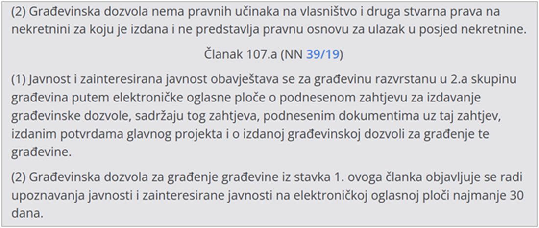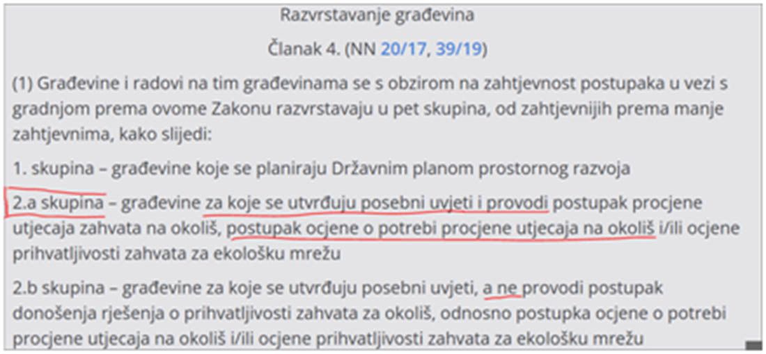 Zakon o građenju u Članku 107. propisuje da se za građevinu razvrstanu u 2.a skupinu MORA OBAVIJESTITI JAVNOST I ZAINTERESIRANA JAVNOST O PODNESENOM ZAHTJEVU ZA IZDAVANJE GRAĐEVINSKE DOZVOLE, što je krivom klasifikacijom izbjegnuto.