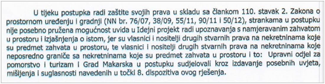 Potpuno skrivanje svih radnji pri izdavanju Lokacijske dozvole vidi se i na strani 4. Lokacijske gdje jasno piše kako nikom nije pokazan sam projekt, a gdje se navode stvarna prava makar je posve jasno da se radi o građenju na pomorskom dobru gdje se stvarna prava ne mogu ostvarivati, niti postoje vlasnici.