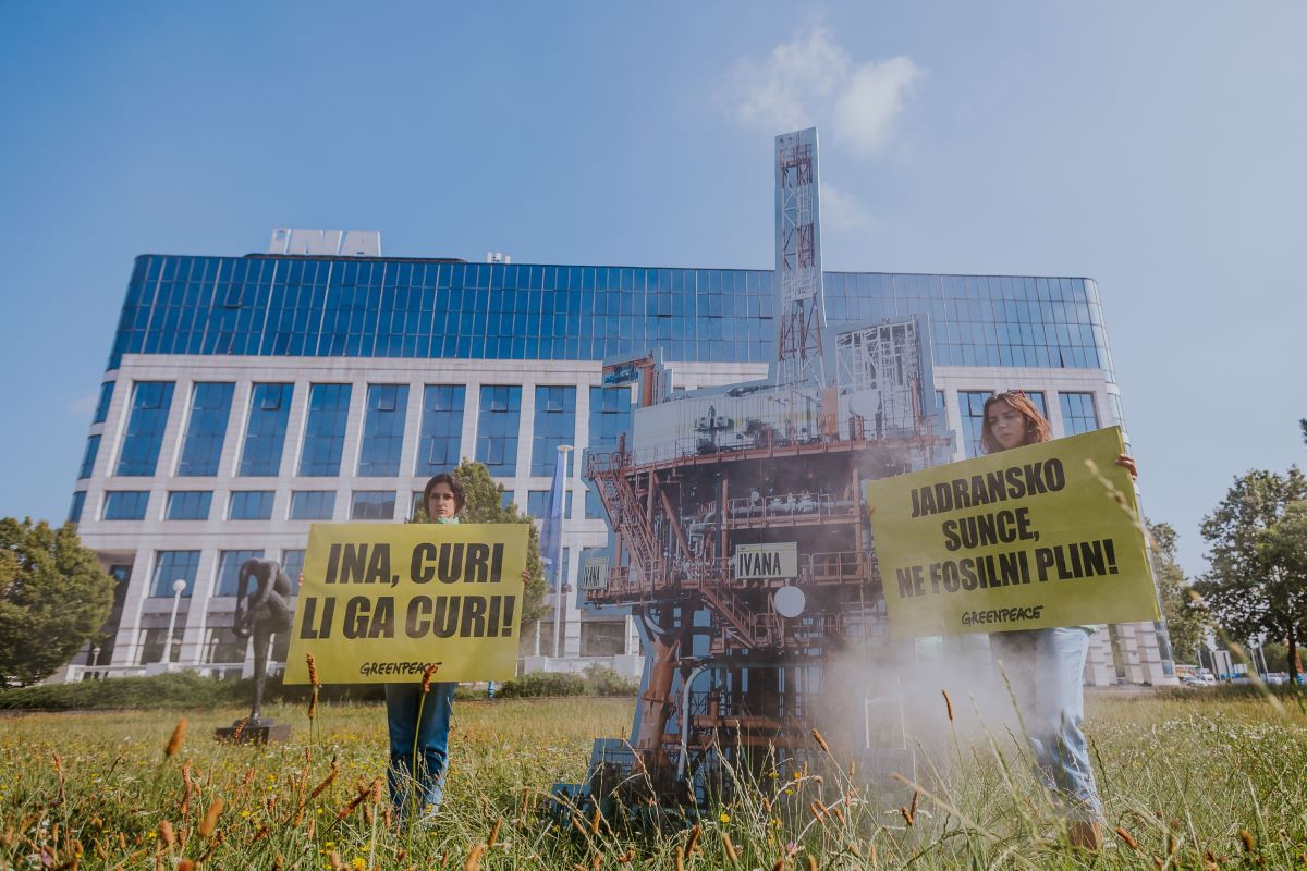 Aktivisti Greenpeacea održali su prosvjed u Zagrebu postavivši ispred sjedišta INA-e simboličan trometarski prikaz plinske platforme koja ispušta fosilni plin u atmosferu. Od samog potonuća platforme Ivana D Greenpeace opetovano poziva nadležne institucije i INA-u da ispitaju moguće emisije metana na svim odobalnim platformama. Ni nakon dvije i pol godine niti nadležno ministarstvo niti INA nisu odgovorili niti se očitovali, poručuju aktivisti.
