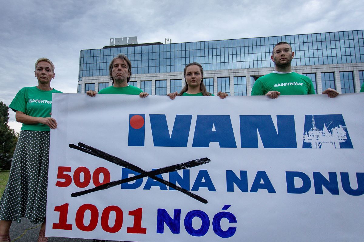 Aktivisti Greenpeacea još jednom su prosvjedovali ispred sjedišta INA-e u Zagrebu, ovoga puta ukazujući na sramotnu činjenicu da je, nakon 1000 dana i 1001 noći od potonuća, plinska platforma Ivana D još uvijek na dnu Jadranskog mora.