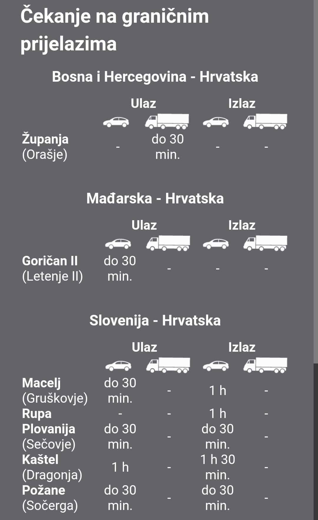 Pojačan je promet na većini cesta prema moru, a gužve su i na izlazima iz Hrvatske, posebno na glavnim cestovnim pravcima A1, A6, A3, Jadranskoj magistrali, Istarskom ipsilonu, trajektnim lukama i pristaništima te na graničnim prijelazima, izvijestio je Hrvatski autoklub. Na izlaz iz Hrvatske čeka se između pola sata i sat i pol, a najveće su gužve, kako javlja HAK, na autocesti A1 Zagreb – Split – Ploče između naplatne postaje Lučko i čvora Karlovac u smjeru Dubrovnika.Zbog prometne nesreće na autocesti A1 između čvorova Zadar I i Zadar II u smjeru Zagreba, vozi se usporeno uz ograničenje brzine 80km/h jednim trakom u koloni u pokretu dugoj oko 500m.POVEĆANA GUSTOĆA PROMETA: