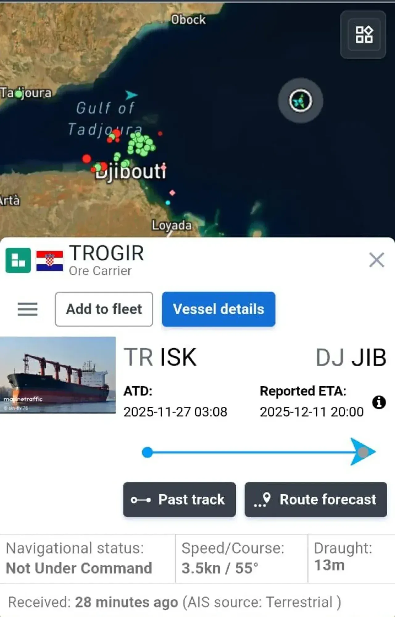 Brod je u Djibouti trebao doći u četvrtak, što se i dogodilo, budući da se na sidrištu ispred luke pojavio jučer. No, do nje je prema svemu sudeći, a prema internetskim servisima koji prate plovidbu brodova po svijetu, stigao u pratnji remorkera "Giant", koji vije liberijsku zastavu.