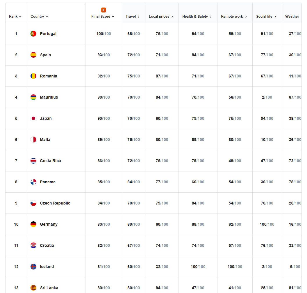 Naime, na svjetskoj listi koju čini ukupno 111 zemlja, Hrvatska je zauzela, kako ova direktorica kaže, odlično 11. mjesto, dok je na europskoj listi naša zemlja zauzela također odlično 7. mjesto. Globalnu listu predvode Portugal, Španjolska, Rumunjska, Mauricijus i Japan, dok su se iza Hrvatske našle zemlje poput Islanda, Šri Lanke, Tajvana, Estonije, Grčke i dr. U KAYAK-u su detaljno analizirali svih 111 zemalja te ih potom rangirali na temelju 22 definirana faktora u šest kategorija koje uključuju: putne troškove i dostupnost, lokalne cijene, zdravlje i sigurnost, mogućnosti rada na daljinu, društveni život i vrijeme.