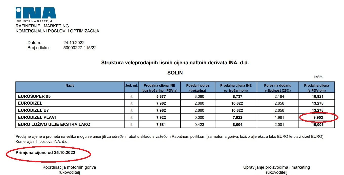 Nevjerojatna situacija dogodila se nakon posljednjeg poskupljenja goriva od prije dva dana, uslijed odluke Vlade da ovaj put neće intervenirati u ništa, osim plavog dizela, čiju je cijenu zadržala na 8.49 kuna. Unatoč tome, INA je odlučila podići cijene, pa prema cjeniku kojeg imamo u posjedu, to gorivo od jučer košta čak 9,90 kn i to po veleprodajnoj cijeni!