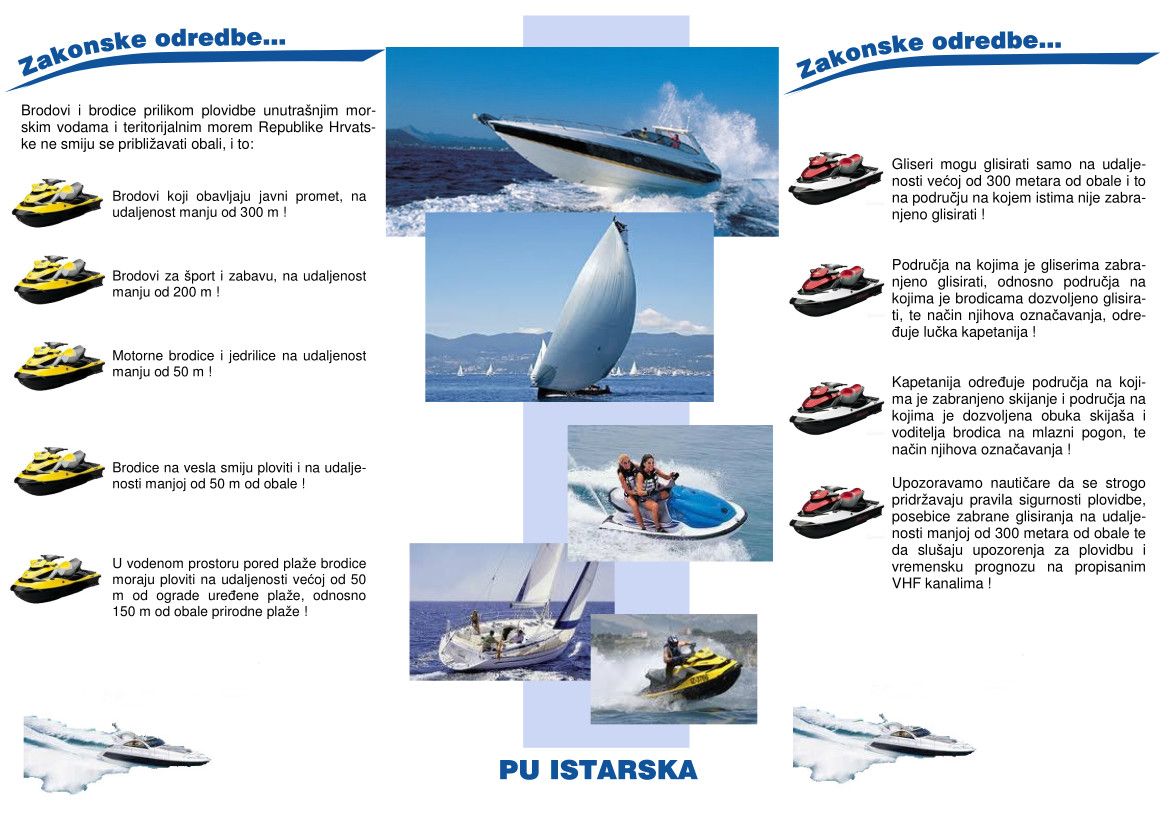 Pomorska policija podsjeća građane i turiste da plovila mogu glisirati samo na udaljenosti većoj od 300 metara od obale te ih pozivamo da se radi zaštite kupača i ronioca pridržavaju te odredbe. Isto tako, kupače upozoravamo da ne plivaju na udaljenosti većoj od 100 metara od obale te na prostorima koji predstavljaju plovni put.