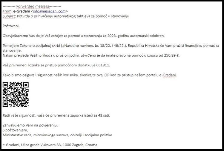 U tekstu poruke navodi se kako je Republika Hrvatska primatelju odredila financijsku pomoć za stanovanje u iznosu od 250,89 eura i da se sustavu e-Građani zbog sigurnosti može pristupiti samo putem QR kôda i pristupne lozinke koja je važeća narednih 48 sati.