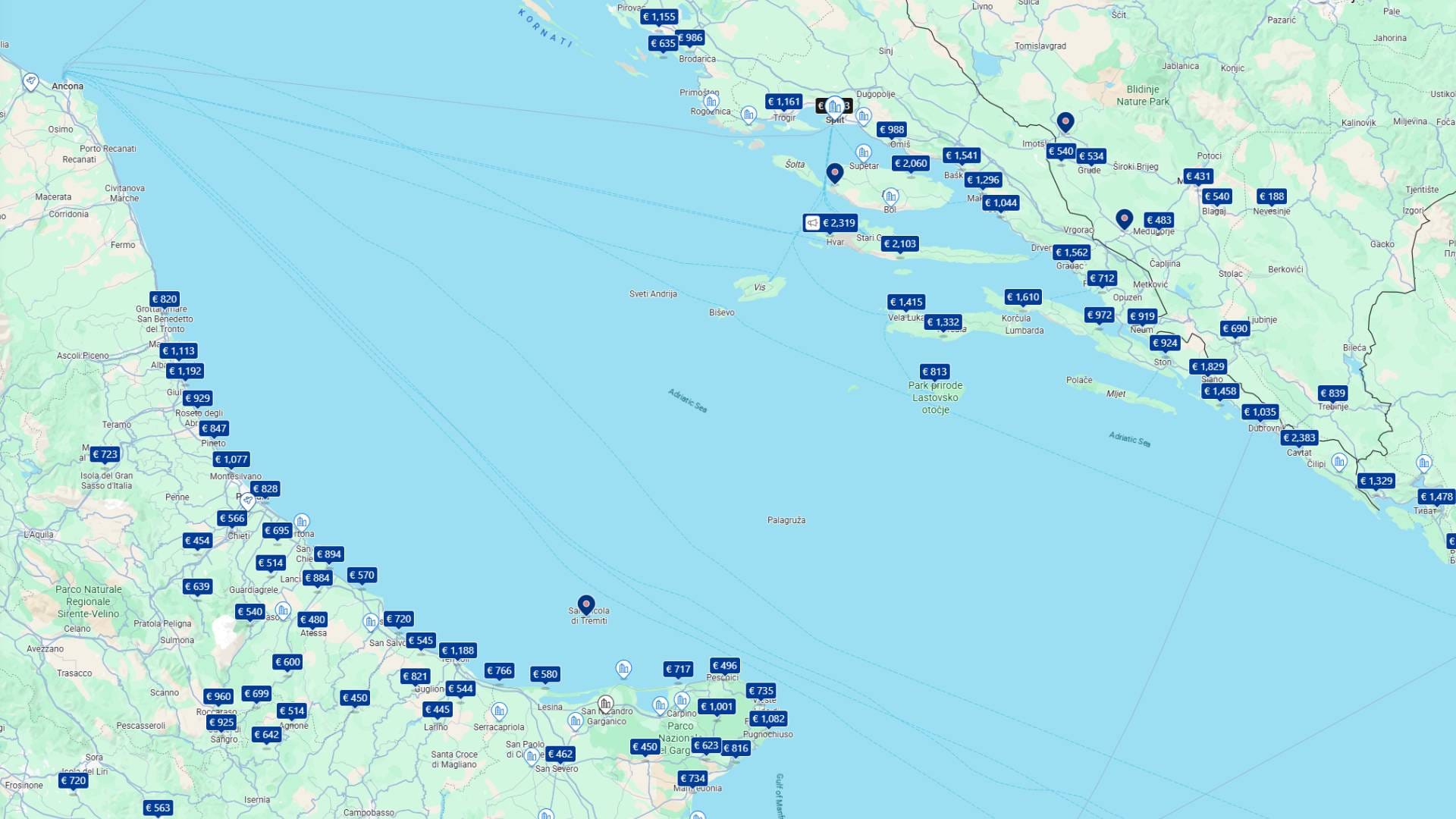 Analizirali smo stotinjak nasumično odabranih objekata na istoj geografskoj širini. U obzir smo geografski uzeli srednju i južnu Dalmaciju i s druge strane, Abruzzo, Molise i Foggiu. Također smo tražili opcije "Hotel" za obitelj s dvoje djece, a trajanje odmora bi bilo tjedan dana.