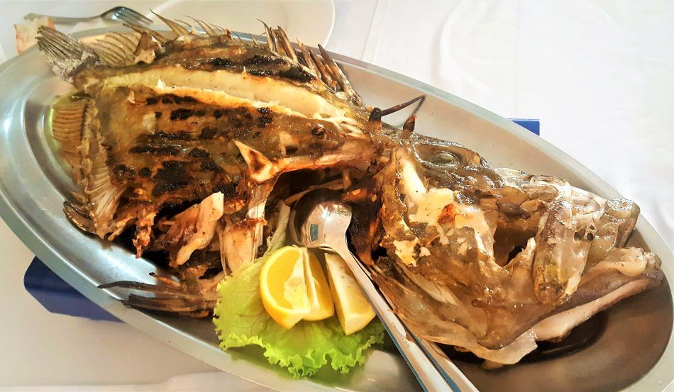 Pečenu ribu je najbolje servirati uz blitvu s krumpirom ili povrćem sa žara, a pije se domaće vino ili gemišt. Stara izreka kaže da riba tri puta pliva: u moru, u ulju i treći put u vinu.