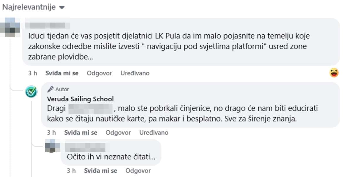 Administrator Facebook stranice ove jedriličarske škole mu je odgovorio da je pobrkao činjenice i da će ga rado "educirati kako se čitaju nautičke karte".
