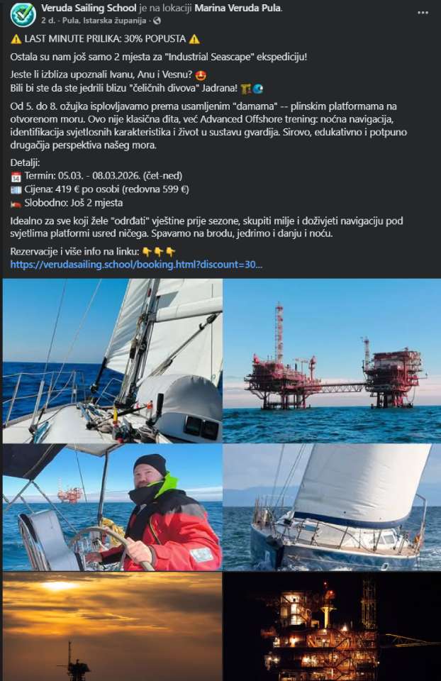 "Jeste li izbliza upoznali Ivanu, Anu i Vesnu? Bili bi ste da ste jedrili blizu "čeličnih divova" Jadrana! Od 5. do 8. ožujka isplovljavamo prema usamljenim "damama" – plinskim platformama na otvorenom moru. Ovo nije klasična đita, već Advanced Offshore trening: noćna navigacija, identifikacija svjetlosnih karakteristika i život u sustavu gvardija. Sirovo, edukativno i potpuno drugačija perspektiva našeg mora", stoji između ostalog u ovom oglasu.