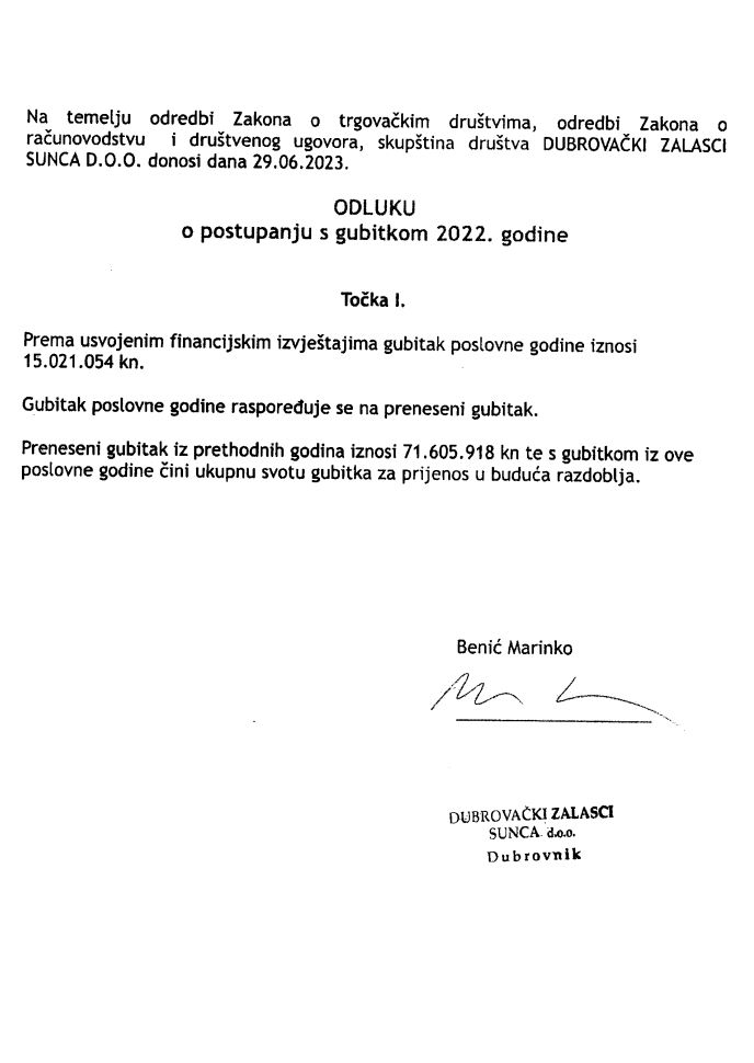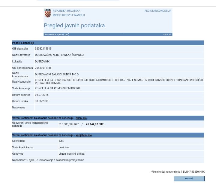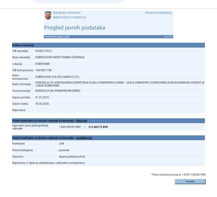 - Tvrtka "Dubrovački zalasci sunca" d.o.o. je poslovanje u 2022. godini, okončala s ukupnim gubitkom od 9,4 milijuna eura ili 71,6 milijuna kuna, pa mi je shvatljiv razlog nemogućnosti da plaća dugove (općenito govoreći). Međutim, tvrtka "Dubrovački zalasci sunca" d.o.o. nije koncesionar sjeverne zone lapadskog kupališta Sumartin (koncesija je prestala 03.07.2020.), niti je koncesionar južne zone lapadskog kupališta Sumartin (koncesija je prestala 22.12.2020.), tako da ne postoji zakonska osnova da nekoncesionar bude obveznik plaćanja koncesijskih naknada za te dvije kupališne zone od 2020. godine.