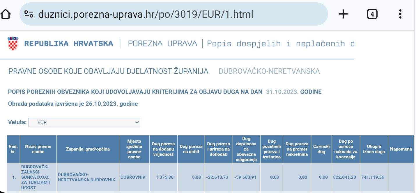Jučer je dubrovniknet.hr objavio vijest da prema podacima Porezne uprave, tvrtka "Dubrovački zalasci sunca" d.o.o. nije podmirila 822.041,20 eura ili 6,2 milijuna kuna koncesijskih naknada. Napisan je ukupan iznos duga, ali bi se moglo procijeniti da je riječ o zbroju nepodmirenih koncesijskih naknada za 2020. (pola fiksnog dijela i variabilni dio), za 2021. (fiksni dio i variabilni dio) i za 2022. (fiksni dio i variabilni dio), upozorava dubrovački profesor Igor Legaz, koji je navedene kaznene prijave i podnio nadležnim organima.