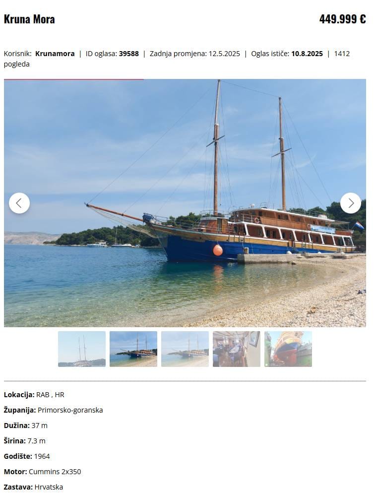 Inače, ovaj 37 metara dug i 7,3 metra širok brod je od svibnja na bubnju i prodaje se za izlistanu cijenu od gotovo pola milijuna, ili, da budemo precizni, 449.999 eura. Navedeno je da je brod putnički, odnosno da mu je namijena krstarenje, ima