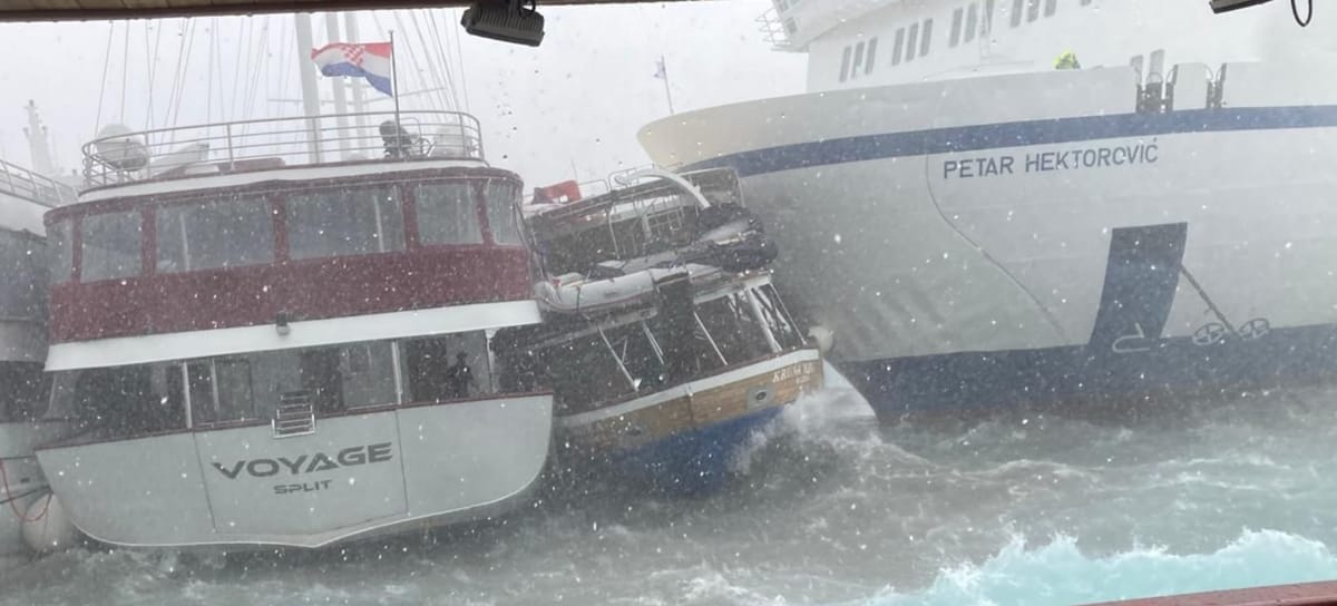 SPLIT - Nakon jučerašnje havarije u splitskoj luci, najteže je nastradao mini-kruzer Kruna Mora, kojeg je uslijed nevremena pogodio Jadrolinijin trajekt Petar Hektorović, koji se pak otrgnuo s veza broj 17 i nošen vjetrom doslovno prignječio prvi u landani mini-kruzera ispred njega.