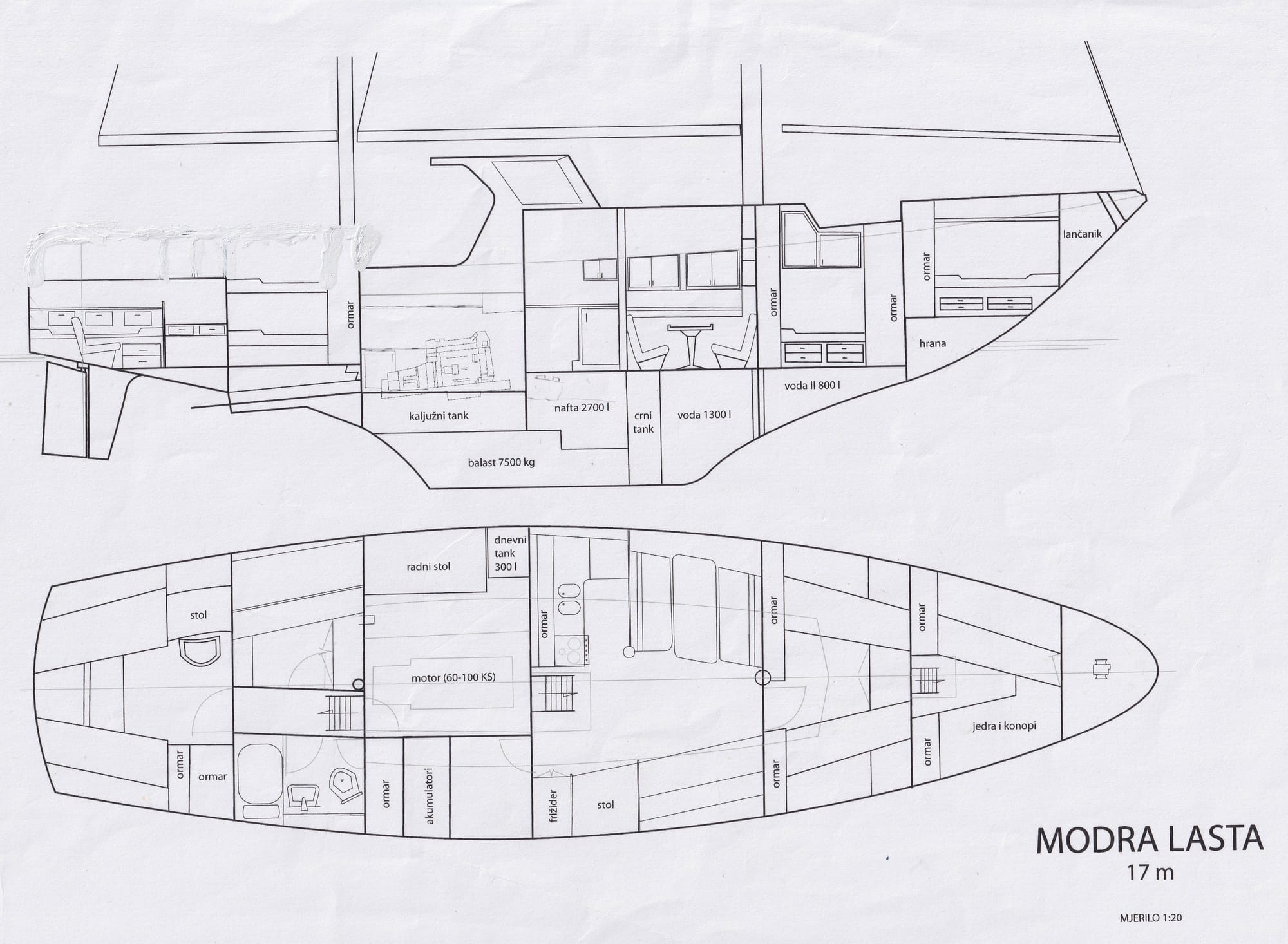 „Modra lasta“ ima 3 kabine za spavanje i malu kupaonicu, kao jedini primjerak po originalnom nacrtu. Naručitelji Joža Horvat, hrvatski književnik, moreplovac i pustolov i supruga Renata Horvat isplovili su 1973. godine iz Splita, no pokušaj drugog oplova oko svijeta prekinut je uslijed obiteljske tragedije (pogibija sina). 1975. godine po prekinutom putovanju, brod je darovan Srednjoj pomorskoj školi u Lošinju, gdje je nažalost potpuno opljačkan pa ga 1980. godine Joža Horvat daruje Jedriličarskom klubu „Delfin“ iz Tivta (Crna Gora) uz obavezu da se brod ne smije otuđiti.