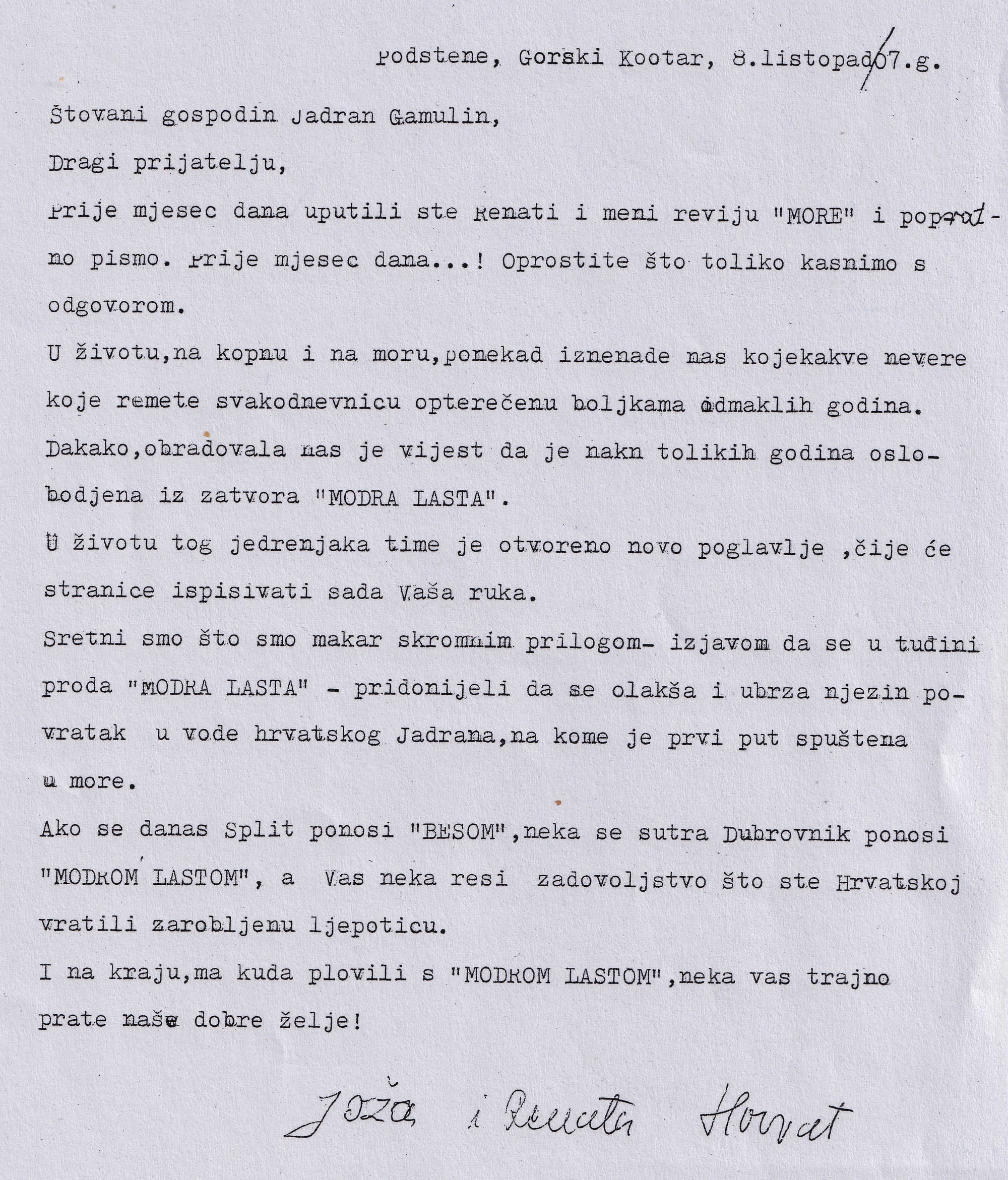 Kako je rekao Joža Horvat: „Živi samo onaj koji za nešto živi“, tako i supruga i ja, mali smo ljudi koji sanjaju veliko i živimo da se „Lasta“ brod obnovi i plovi, na spomen Renati i Joži - prepričava za Morski HR Darko Zanki.