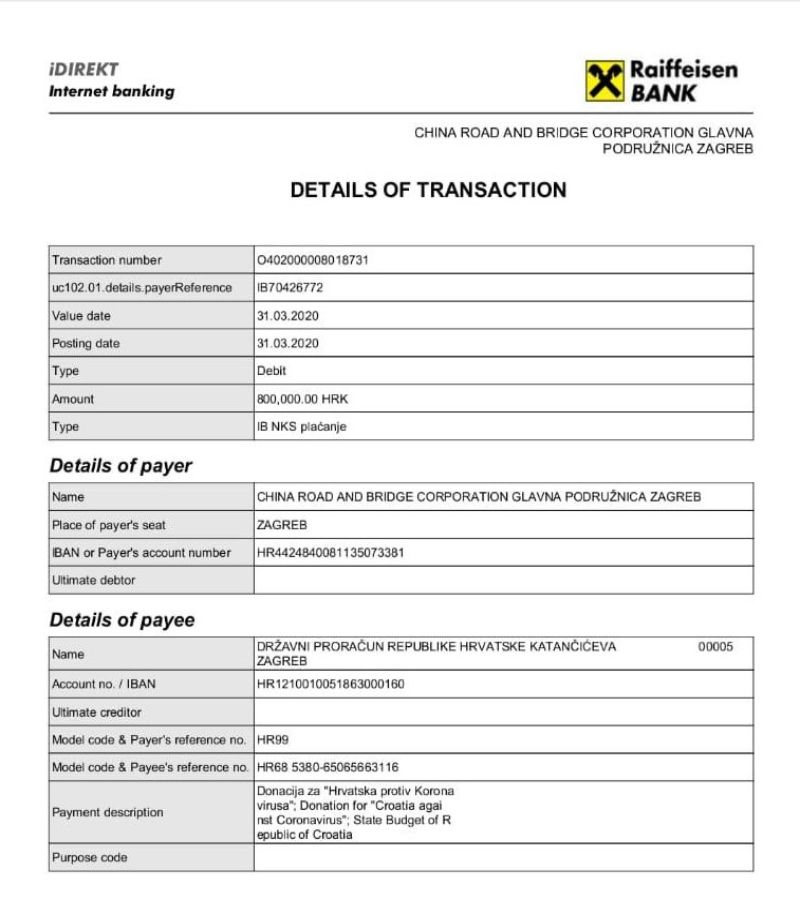 – China Road and Bridge Corporation, izvođač i graditelj projekta od strateške važnosti za Hrvatsku – Pelješkog mosta, u utorak 31. ožujka uplatio je iznos od 800.000 HRK na račun koji je Vlada Republike Hrvatske otvorila za uplatu donaciju za pomoć hrvatskim građanima i vladi u borbi protiv virusa Covid-19.
