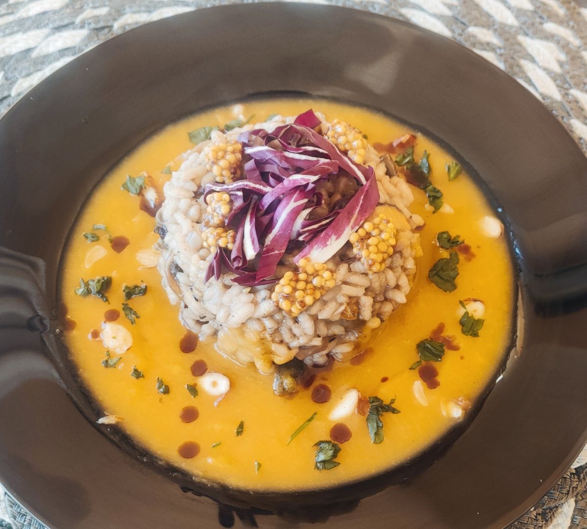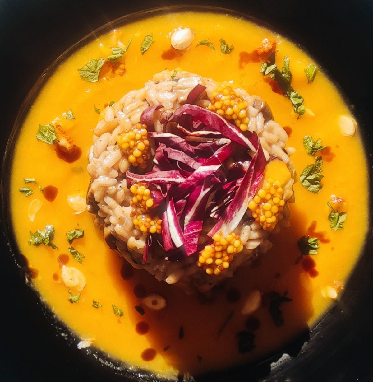 Pred vama je jedan zahtijevan recept s puno elemenata, ali je finalan rezultat prekrasan i vrijedan Vašeg truda. Konceptualno, inspiracija za jelo nalazi se točno na pola puta između Azije i Europe, pošto je tamo običaj posluživati bijelu rižu sa umakom, što me nagnalo da pomislim: „Zašto ne bi poslužio „naš“ rižoto skuhan tradicionalno, sa drugačijim umakom koji mu paše i komplimentira ga, poštujući okuse našega kraja? Zar to ne bi bilo odlično?“.
