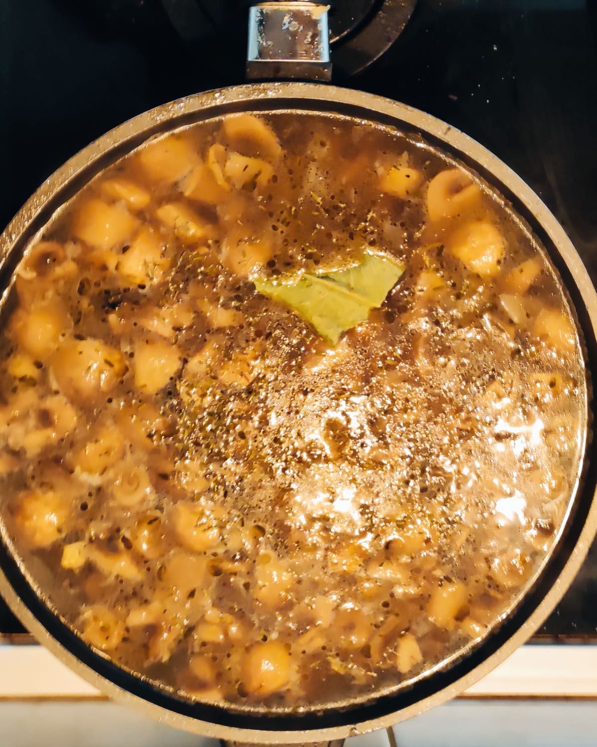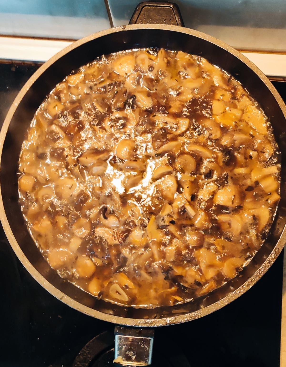 Cilj je da sačuvate svu vodu koju gljive puštaju. Provjerite svoju tavu nakon minute, te, ukoliko je potrebno, dolijte malo vode u ovom trenutku da potaknete ekstrakciju tekućine iz gljiva. Kada ste izvukli većinu vode iz istih, dolijte vaš brandy/prošek i vino, i otklopite, te na laganoj vatri pirjajte dok alkohol ne ishlapi. Sada u vaš temeljac dodajte i one sušene gljive skupa sa vodom u kojoj su se namakale, te dolijte vode da dobijete 1.5l temeljca. Dosolite i popaprite po potrebi i dodajte timijan, majčinu dušicu, 1 list lovora i malo ružmarina.