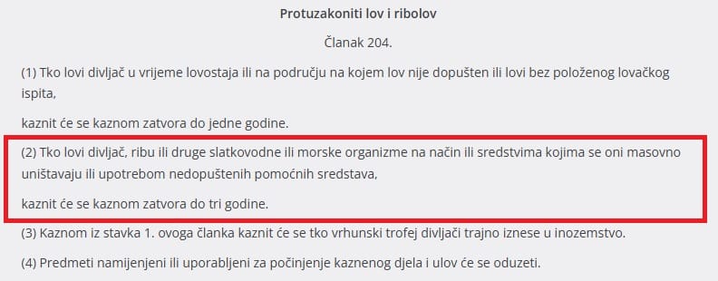 Lov ribe uz pomoć kemijskih i drugih nedopuštenih sredstava spada u krivolov i podliježe sankcioniranju, sukladno Kaznenom zakonu i zakonu o morskom ribarstvu. Prema Zakonu o morskom ribarstvu Ribe i drugi morski organizmi u ribolovnom moru obnovljivi su dijelovi prirode od interesa za Republiku Hrvatsku i imaju njezinu osobitu zaštitu koja se provodi sukladno sa odredbama ovoga Zakona.