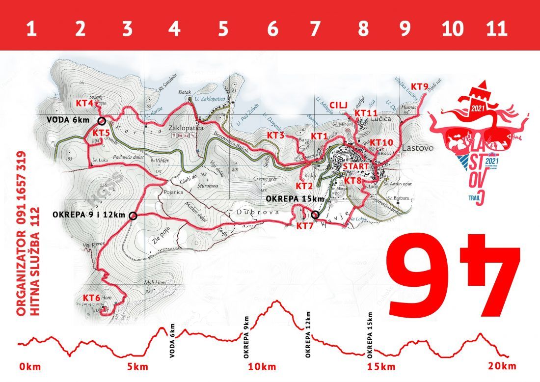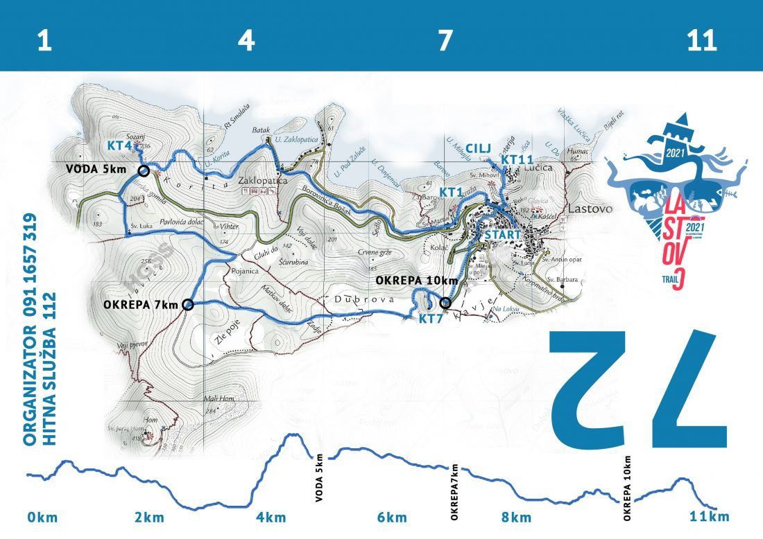 Nakon toga se staza starim težačkim putem spušta u Zaklopaticu i u uvalu Korita odakle se uspinje novom planinarskom stazom na jedan od najljepših vidikovaca na otoku – Sozanj – KT4. Drugi dio staze se spaja pored crkvice Sv. Luke na stari put Ubli – Lastovo koji preko lastovskih maslinika i vinograda vodi do Sv. Ilije – KT7, smještenog iznad bogatog lastovskog polja. Zadnju kontrolu prije cilja u uvalu Mihajla smo smjestili na uzvisini Baterija iznad Lučice – KT11, s koje se pruža savršen pogled na zalazak sunca i ciljnu ravninu.