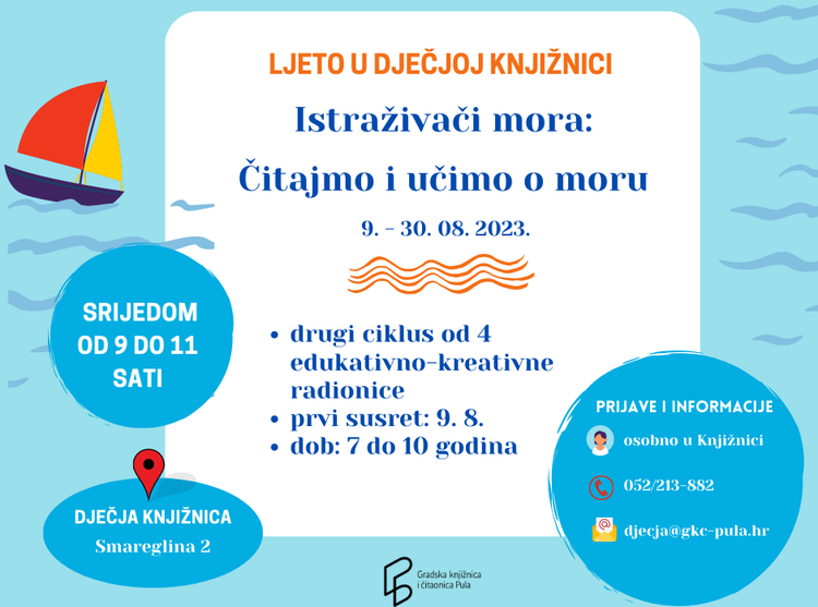 PULA - U sklopu programa Ljeto u Dječjoj knjižnici održava se ciklus radionica Čitajmo i učimo o moru. Riječ je o ciklusu od četiri uzastopne radionice srijedom koje započinju 9. kolovoza 2023. godine.