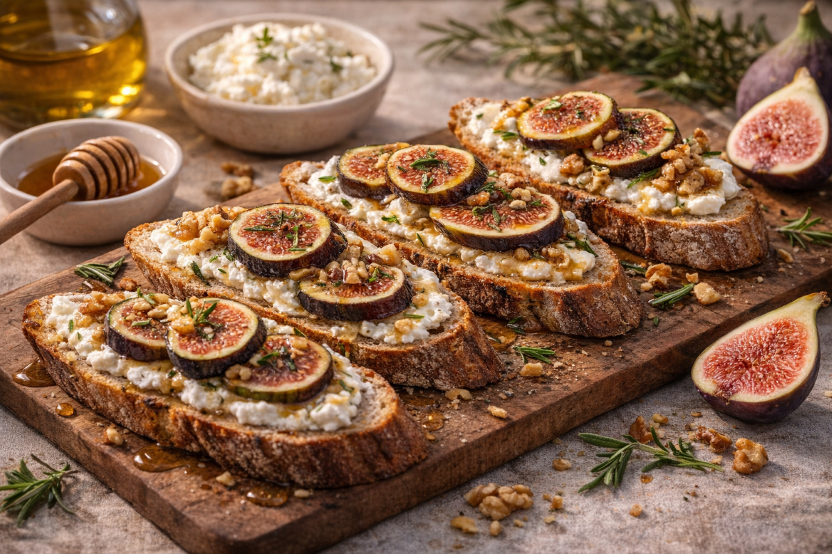 Kruh narežite na tanke kriške, pokapajte maslinovim uljem i kratko prepecite u pećnici. Premažite ricottom, dodajte narezane smokve i grubo sjeckane orahe. Završite s nekoliko kapi meda i sitno nasjeckanim ružmarinom.