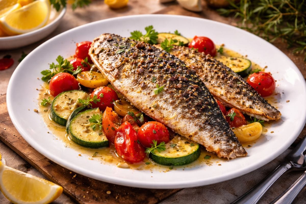 Filete posolite i popaprite te ih kratko zapecite na maslinovom ulju (kožom prema dolje). Dodajte češnjak i podlijte bijelim vinom. Umiješajte limunov sok i malo naribane korice. Povrće narežite i ispecite na tavi s maslinovim uljem i timijanom.