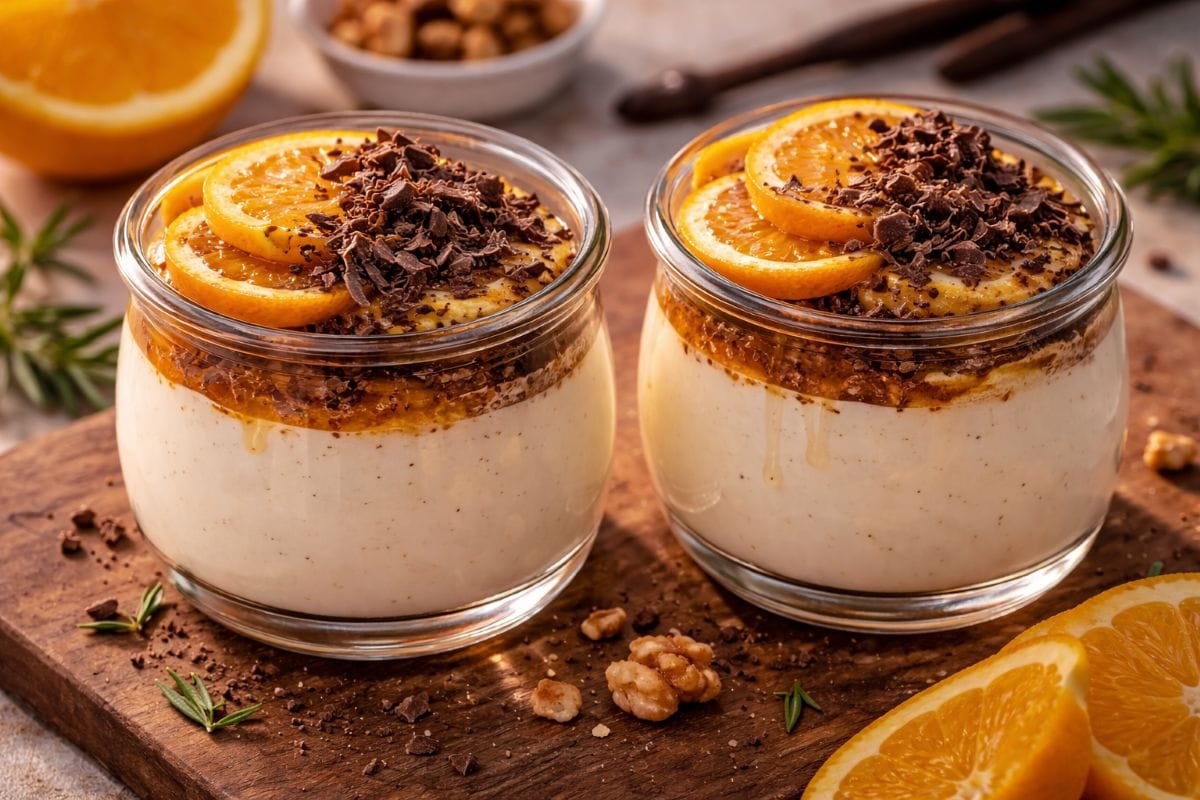 Zagrijte vrhnje s medom i vanilijom (ne kuhati). Dodajte namočenu želatinu i naribanu koricu naranče. Ulijte u čaše i ostavite u hladnjaku najmanje 3 sata. Prije posluživanja naribajte tamnu čokoladu po vrhu.