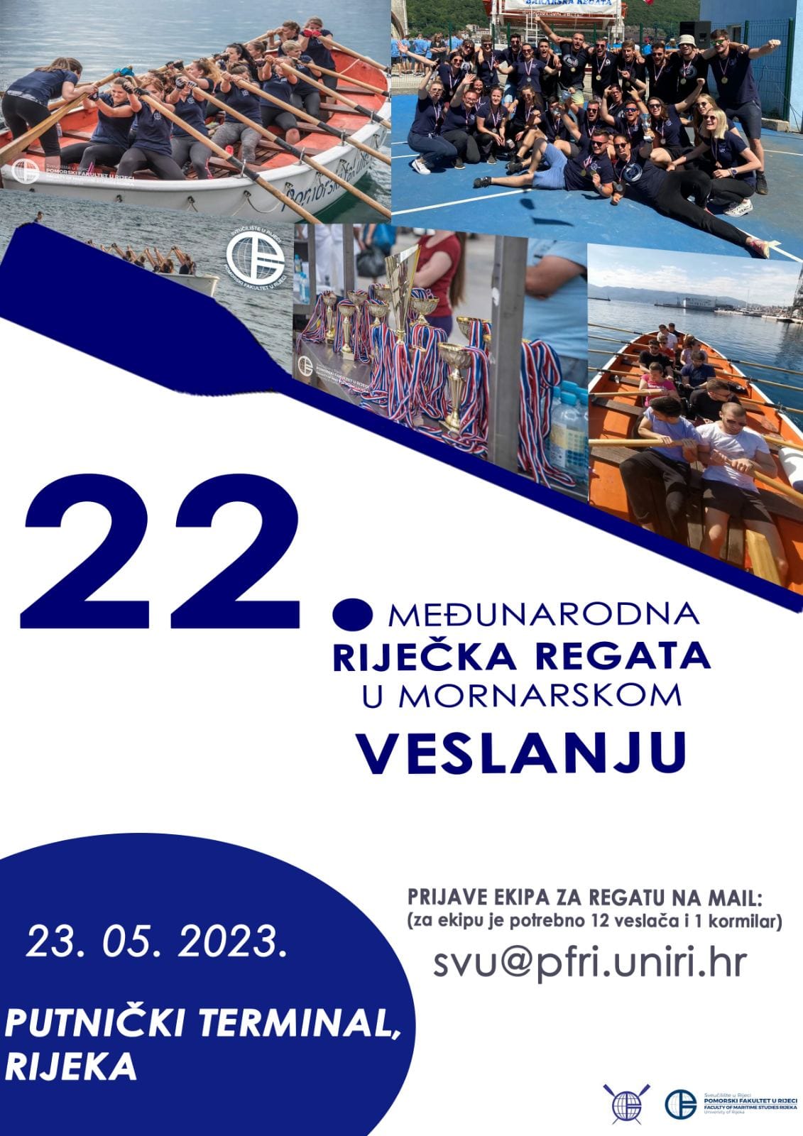 U organizaciji Pomorskog fakulteta Sveučilišta u Rijeci, u utorak, 23. svibnja 2023. godine s početkom u 17:30 sati u akvatoriju putničke luke Rijeka održava se tradicionalna 22. Međunarodna riječka regata u mornarskom veslanju.