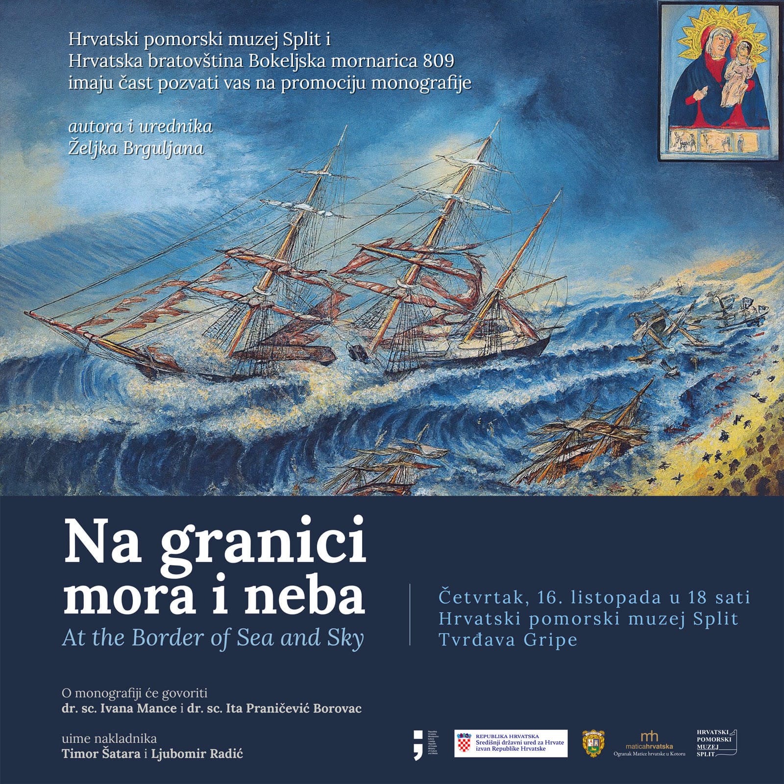 Autor knjige je inspirativni i neumorni profesor Željko Brguljan, istaknuti poznavatelj kulturne baštine i maritimnog slikarstva Boke Kotorske, autor 16 knjiga i preko 100 članaka o bokeljskim temama. Prvo izdanje ove knjige objavljeno je u Perastu 2015. godine i ubrzo je rasprodano. Deset godina kasnije, novo prošireno izdanje, u zajedničkoj nakladi objavljuju Hrvatski pomorski muzej Split, Hrvatska bratovština Bokeljska mornarica 809 Zagreb i Ogranak Matice hrvatske u Boki Kotorskoj – Kotor. Knjiga je prvo predstavljanje imala u Kotoru, potom u Dubrovniku, a sada je prigoda za upoznavanje splitske publike sa ovom iznimnom monografijom.