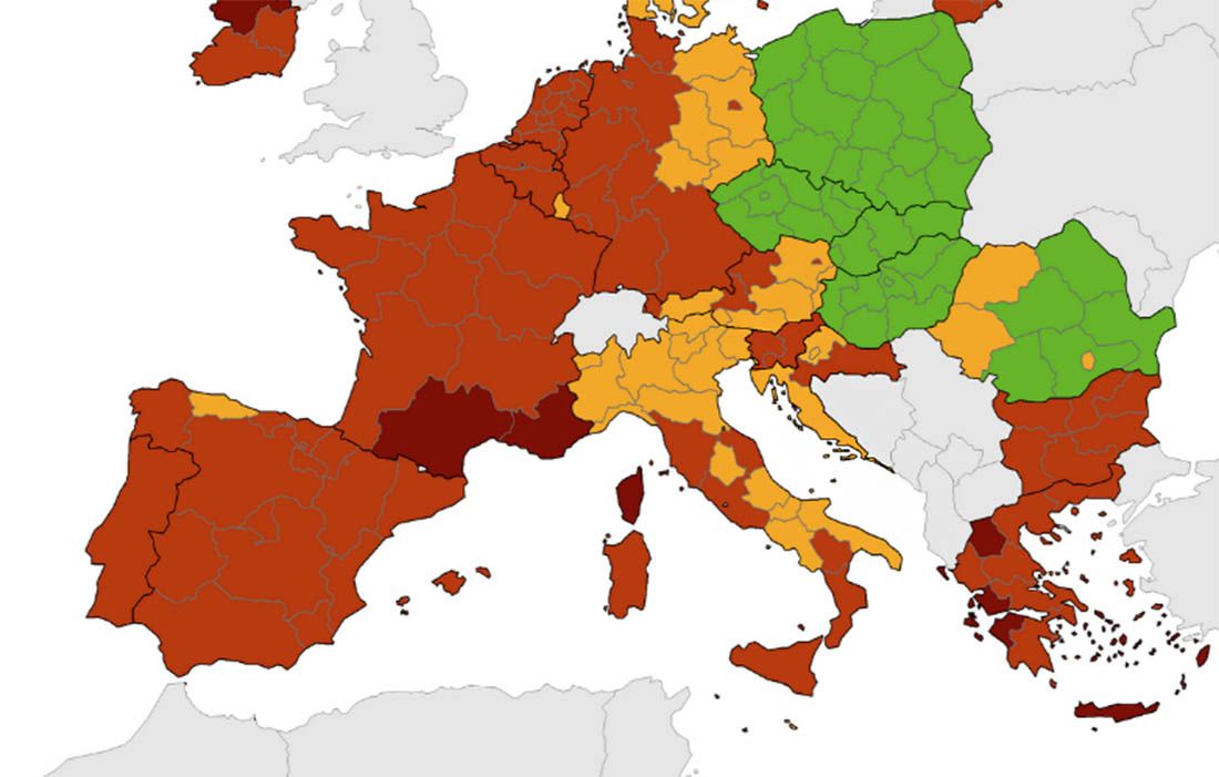 Epidemiološka karta ECDC-a za Europu objavljuje se svaki tjedan na temelju 14-dnevne incidencije i udjela pozitivnih testova u ukupnom broju testiranih.