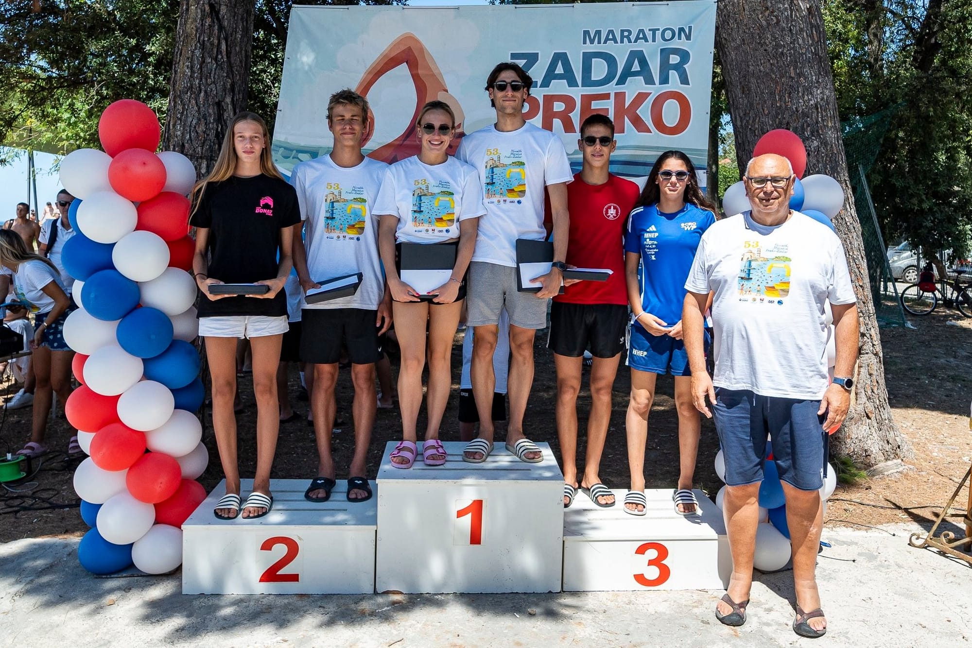 PREKO/ZADAR - Čak 143 plivača sudjelovala su na ovogodišnjem izdanju maratona Preko Zadar, a pobjednici su bili Marin Mogić s vremenom 50.18 i Matea Sumajstorčić (58.10). Najmlađi natjecatelj bio je član PK Zadar Matej Sinovčić (10), a najstariji natjecatelj Ante Cvitanović (81).