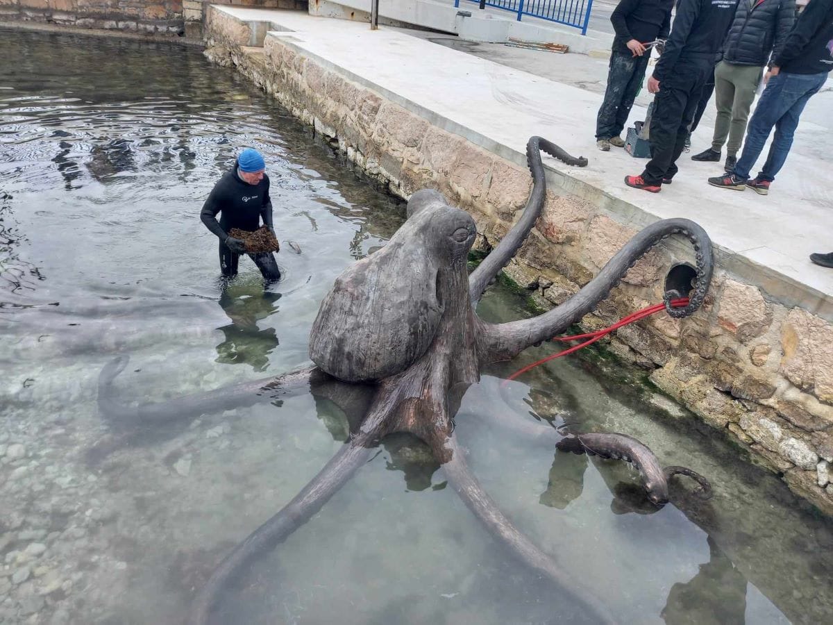 TISNO - Mulo u Tisnom s kopnene strane mosta napala je divovska hobotnica. Riječ je o skulpturi od bronce, koja je oložena u plićak i 'pokušala' izaći na suho na rivu.