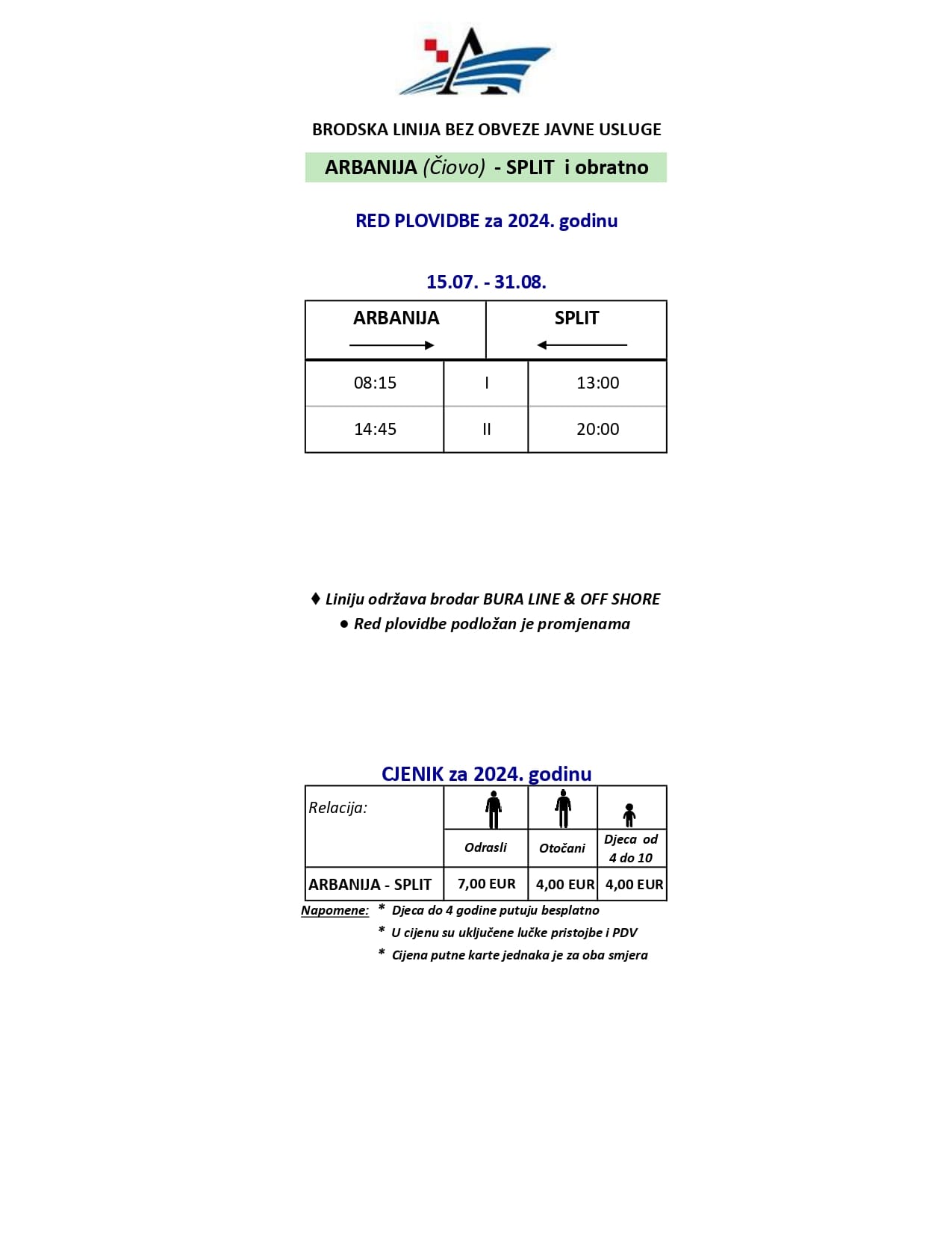 Brodom će otočani do Splita za samo 15 minuta, a prema redu plovidbe kojeg je objavila Agencija za obalni linijski promet, dnevno će ploviti dva puta. Iz Arbanije za Split u 08.15 i 14.45. i iz Splita natrag na Čiovo u 13.00 i 20.00 sati
