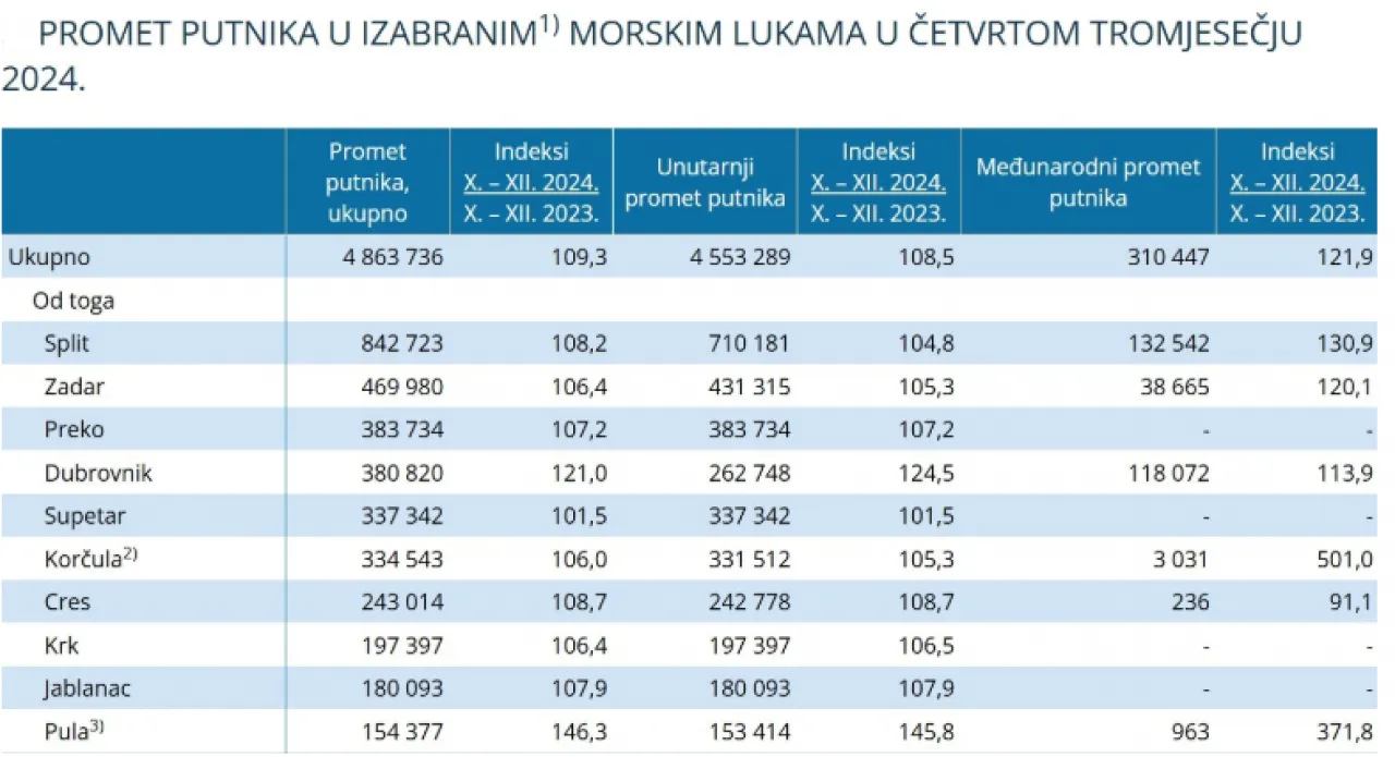 Putnika je i u četvrtom tromjesečju 2024. u morskim lukama bilo više nego u istom razdoblju 2023., za 9,3 posto više ili njih 4,8 milijuna, a iz DZS-a napominju i da je više prevezenih putnika bilo u svim većim lukama i u međunarodnom prometu.