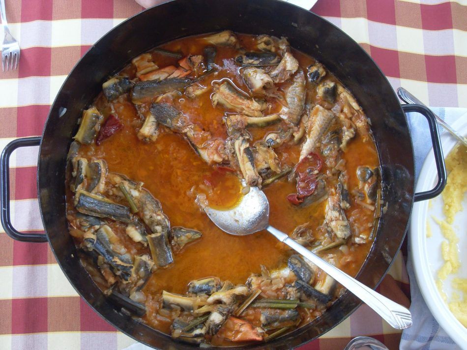 Kad se rajčice dovoljno ukuhaju, ubace se jegulja (1 kg), zarezana na „zvona“ odgovarajuće duljine (4-5cm) i riba (cijele plotice a cipli se prerežu na 2-3 komada zavisno od veličine).