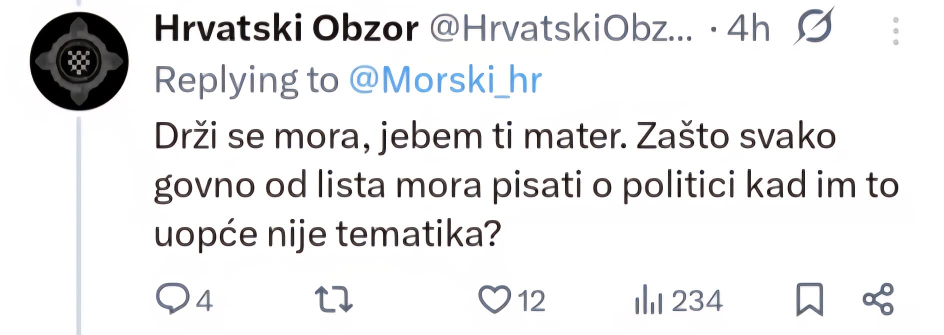 Hrvatski obzor bio je hrvatski politički tjednik koji je u novije vrijeme Republike Hrvatske izlazio od 1995. do 2000. godine. Ne postoji, dakle, više od 25 godina, no no netko pod tim pseudonimom od travnja 2024. godine ordinira na Twitteru tako što javno proziva, vrijeđa, psuje i prijeti novinarima, portalima, političarima ili pojedincima koji mu ne odgovaraju zbog tema kojima se bave i od tad ima preko 2000 objava. I ovo ne bi bilo ništa sporno da se istodobno ne hvali hrpom ilegalnog oružja, za kojeg kaže da ga posjeduje.