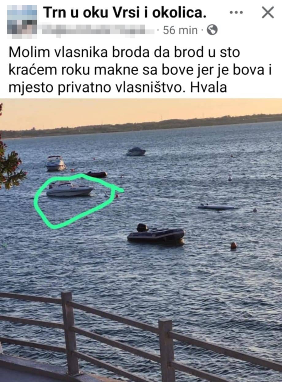 Jedna je žena u Facebook grupi "Trn u oku Vrsi i okolica", objavila neobičan oglas: "Molim vlasnika broda da brod u što kraćem roku makne s bove, jer je bova i mjesto privatno vlasništvo", poručila je i objavila fotografiju gdje je zaokružila plovilo koje joj je zasmetalo.