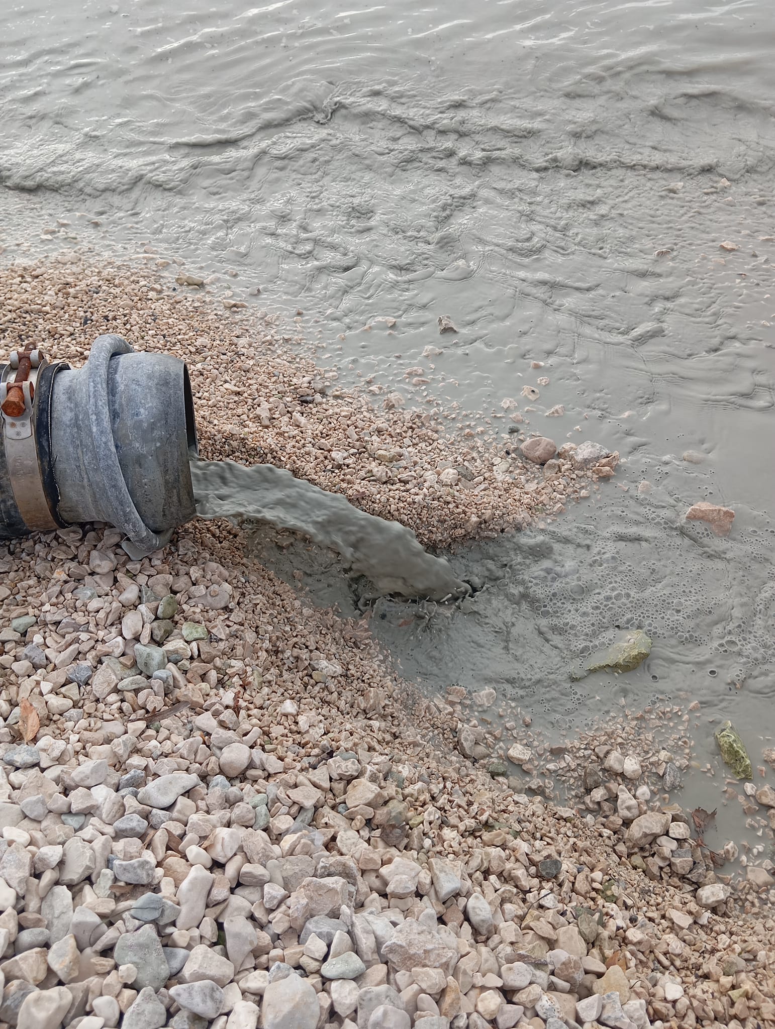 U slučaju kojeg navodite, zasigurno se ne radi o betonu niti o sličnim pojavama. Vidljivom stupanju zamućenja najvjerojatniji je uzrok prodor morske vode iz rova koja zbog pojave plime konstantno dotječe i usporava radove.