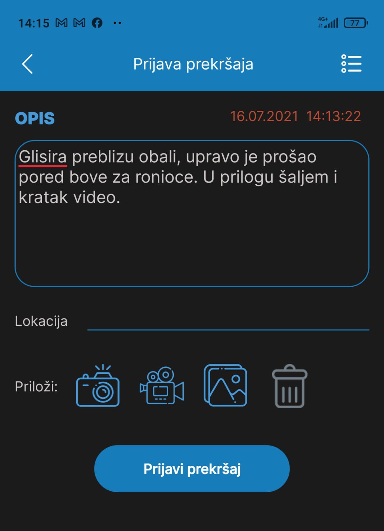 Primjerice, želite prijaviti opasno glisiranje blizu obale? Nema problema, snimite počinitelja/prekršaj i pošaljite putem aplikacije uz opis događaja. Ne trebate čak ni znati točnu lokaciju, jer će je sustav preko GPS-a povući sam. Ovdje treba napomenuti da morate imati uključenu GPS lokaciju da bi kapetanija mogla otići u postupanje, jer sustav ne prepoznaje opisivanje lokacije. No u slučaju pogibelji ili bilo kakve hitnosti, preko aplikacije možete pozvati upomoć i MRCC centar u Rijeci (Maritime Rescue Coordination Cenre), će vas preko vaše GPS pozicije pronaći odmah.