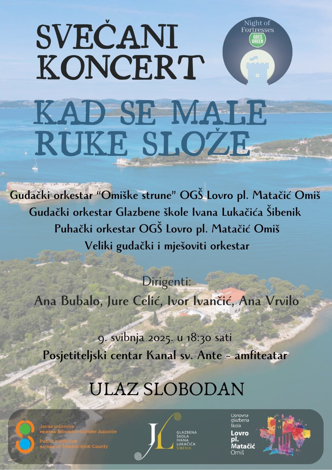 Dvije glazbene škole iz dva hrvatska grada na ušću rijeka Krke i Cetine, Šibenika i Omiša, priredit će prave glazbene poslastice – koncert učenika Glazbene škole ,,Ivan Lukačić“ iz Šibenika i Osnovne glazbene škole ,,Lovro pl. Matačić“ iz Omiša – Orkestra u gostima, pod nazivom ,,Kad se male ruke slože“.
