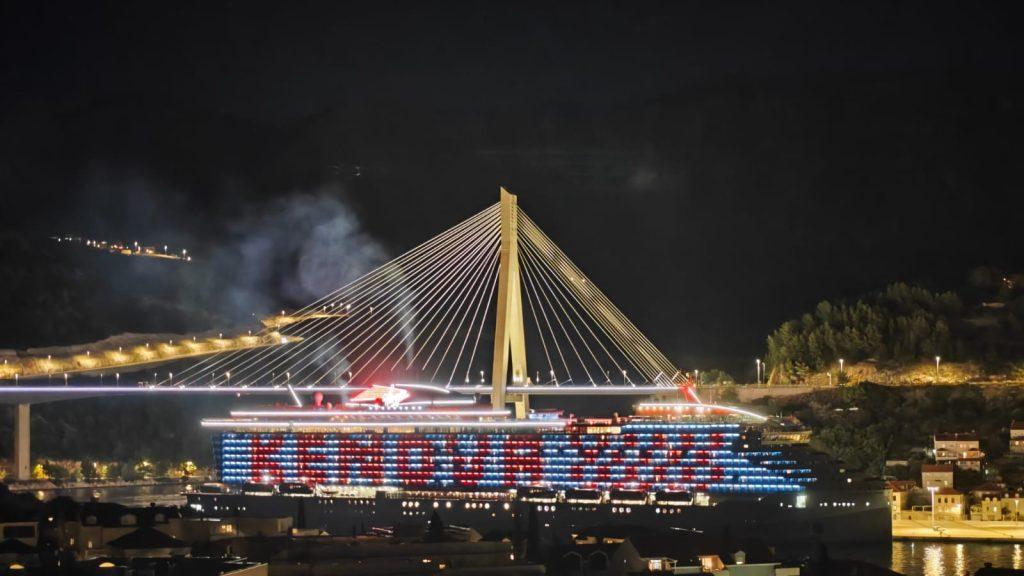 Podsjetimo, navedeni kruzer je već u dubrovačku luku Gruž uplovio s istaknutim pozdravom “KENOVA” te isplovljavao iz Splita s porukom “EVALA“.