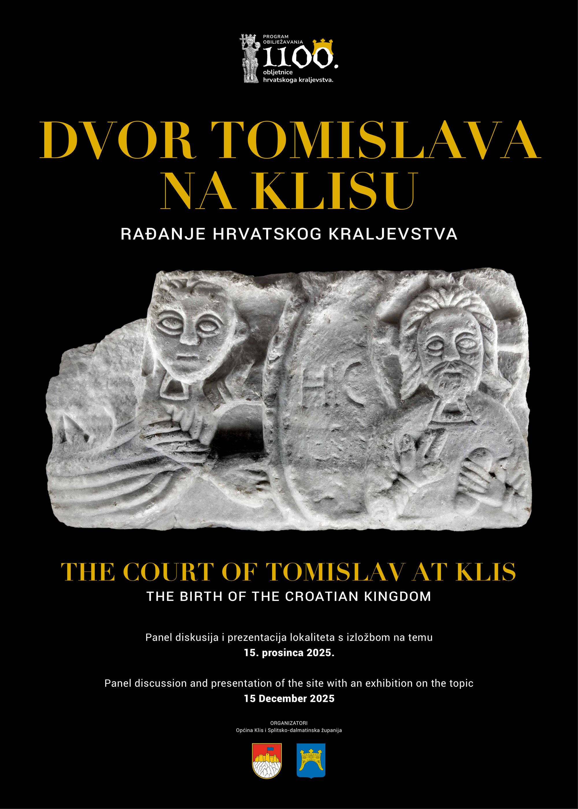 Općina Klis i Splitsko - dalmatinska županija pozivaju otvorenje izložbe „Dvor Tomislava na Klisu – Rađanje Hrvatskog Kraljevstva“, i na panel-diskusiju u Topničkoj kasarni na tvrđavi Klis, 15. prosinca 2025. od 9:30 sati. Program je dio nacionalnog obilježavanja Godine 1100. obljetnice Hrvatskoga Kraljevstva, a izložba se provodi u okviru projekta Jezik - Jesen Zima kulture, upravo sufinanciranog sredstvima Splitsko-dalmatinske županije.