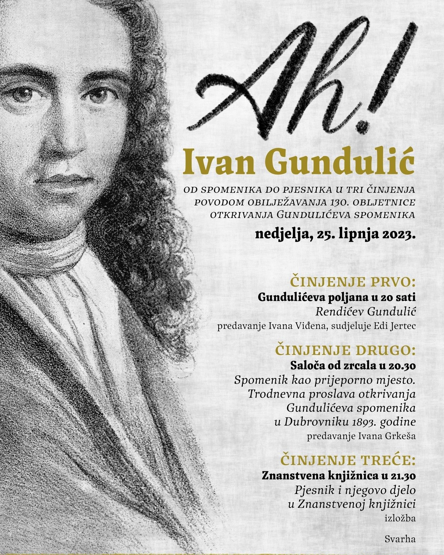 Program se nastavlja na Gundulićevoj poljani u 20 sati, kad započinje program Dubrovačkih knjižnica pod nazivom „Ah! Ivan Gundulić – od spomenika do pjesnika u tri činjenja“.