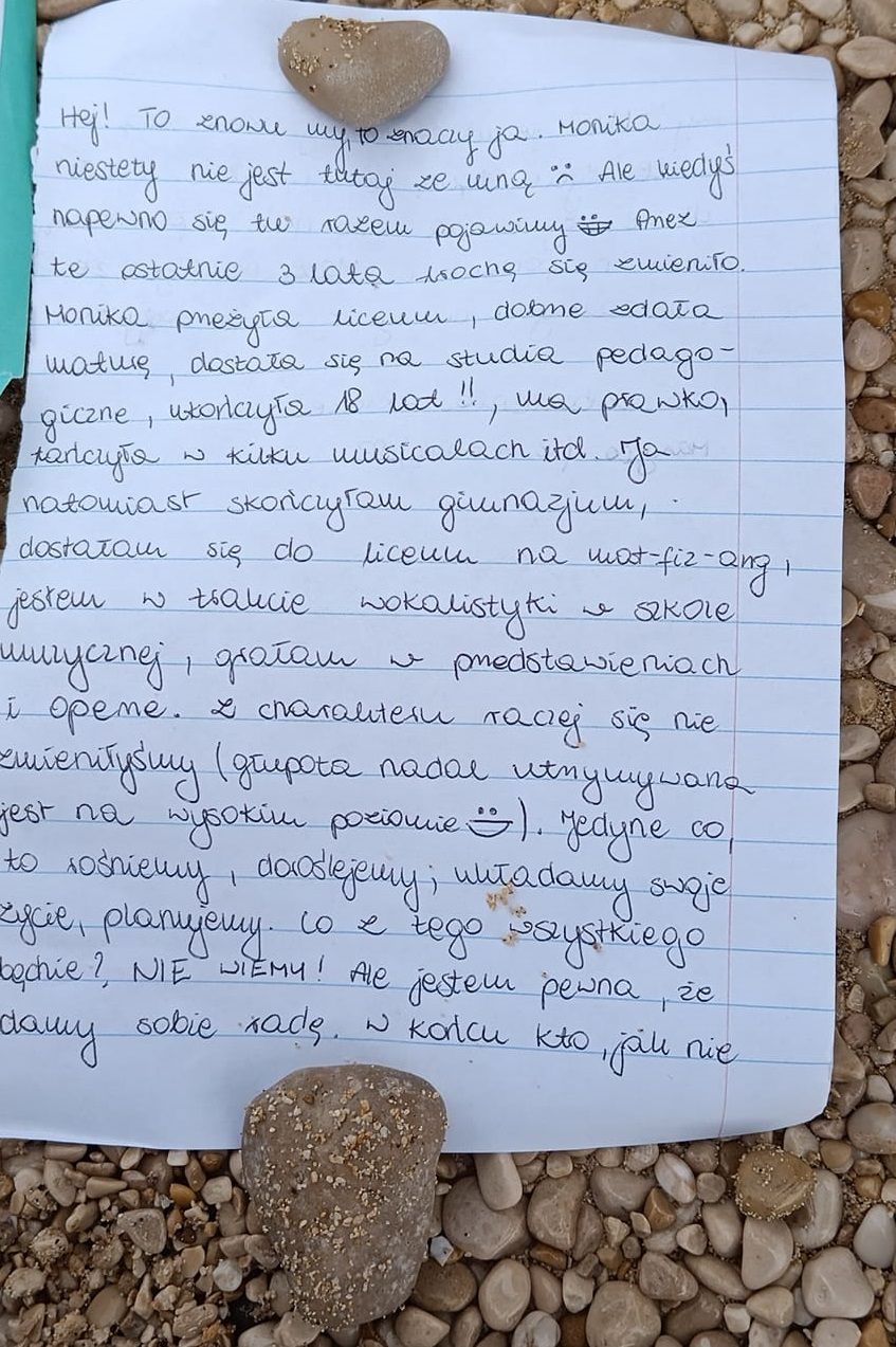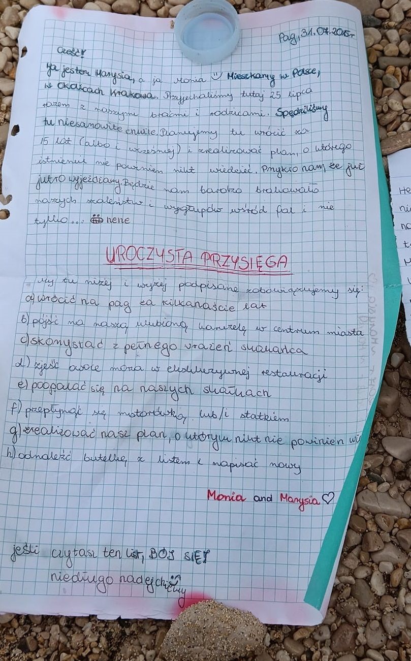 PAG - Dvije djevojke iz Poljske, stigle su 2015. godine na ljetovanje u Hrvatsku na otok Pag. Dan prije odlaska, odlučile su napisati pismo, u kojem su same sebi zadale nekoliko zadataka i obećanja, od kojih je jedno: pronaći ovu bocu i dodati nove bilješke.